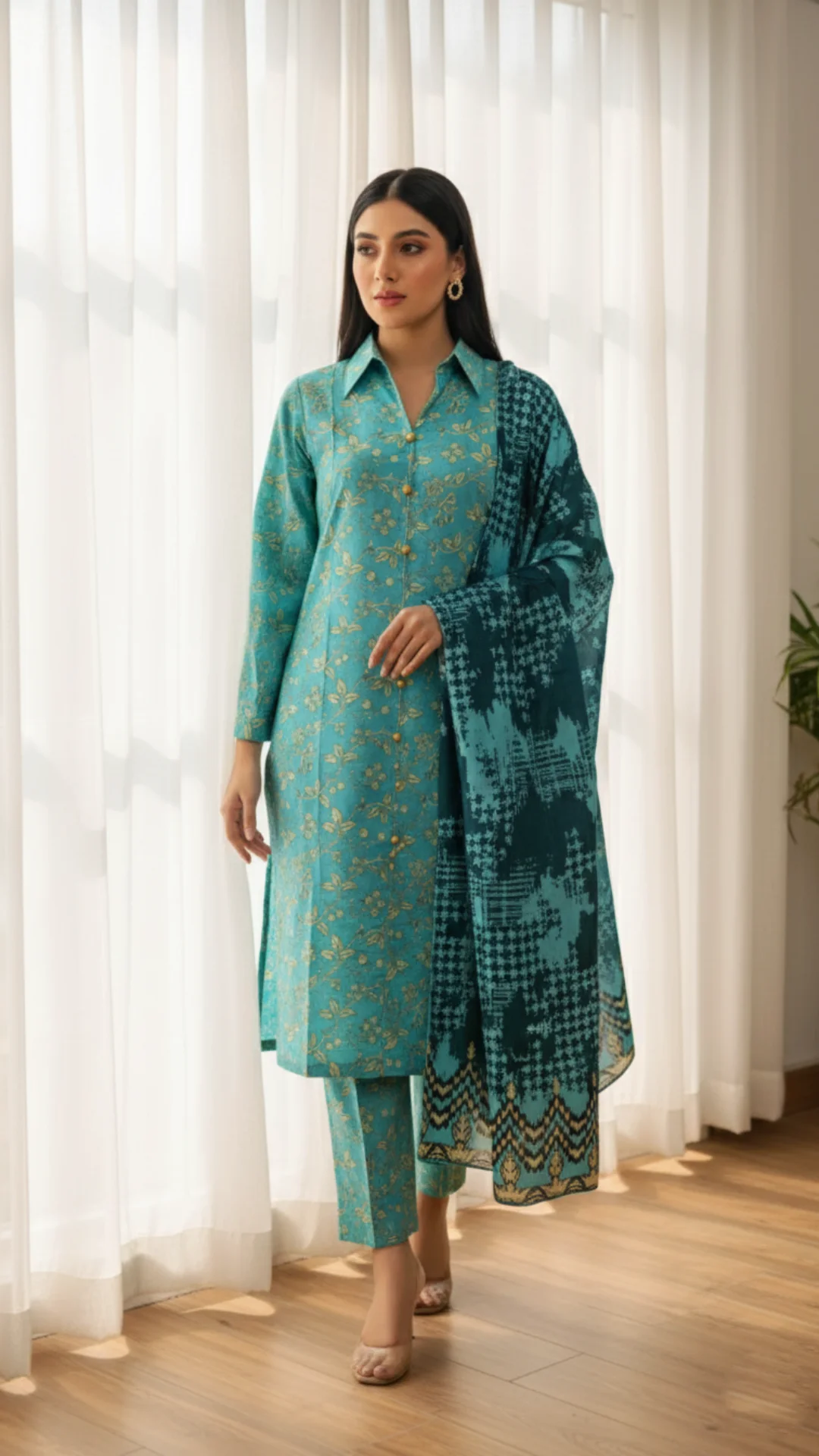 Color: Aqua Blue base with a Soft Yellow floral print, featuring a contrasting Dupatta in Teal and Sky Blue patterns.