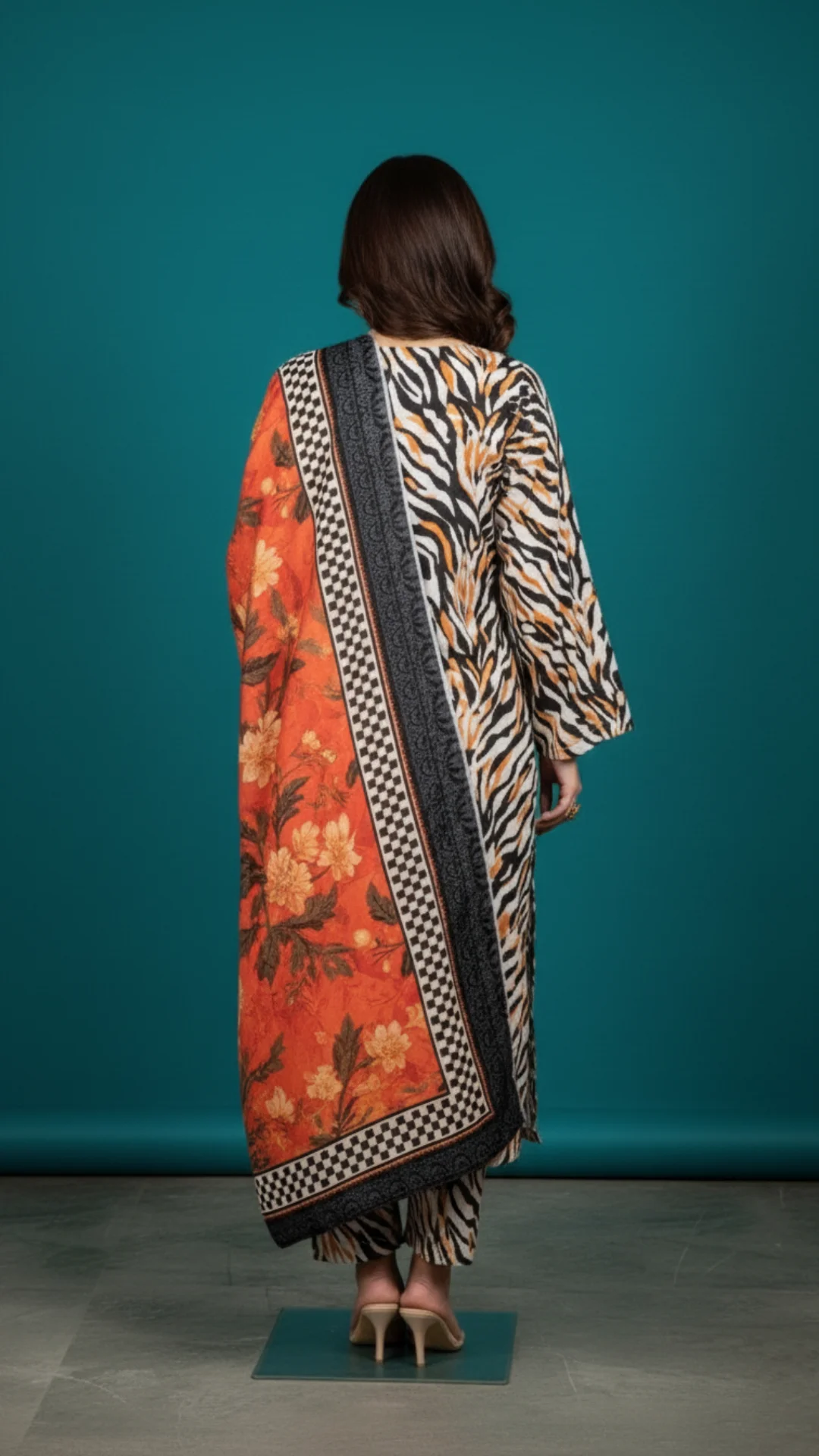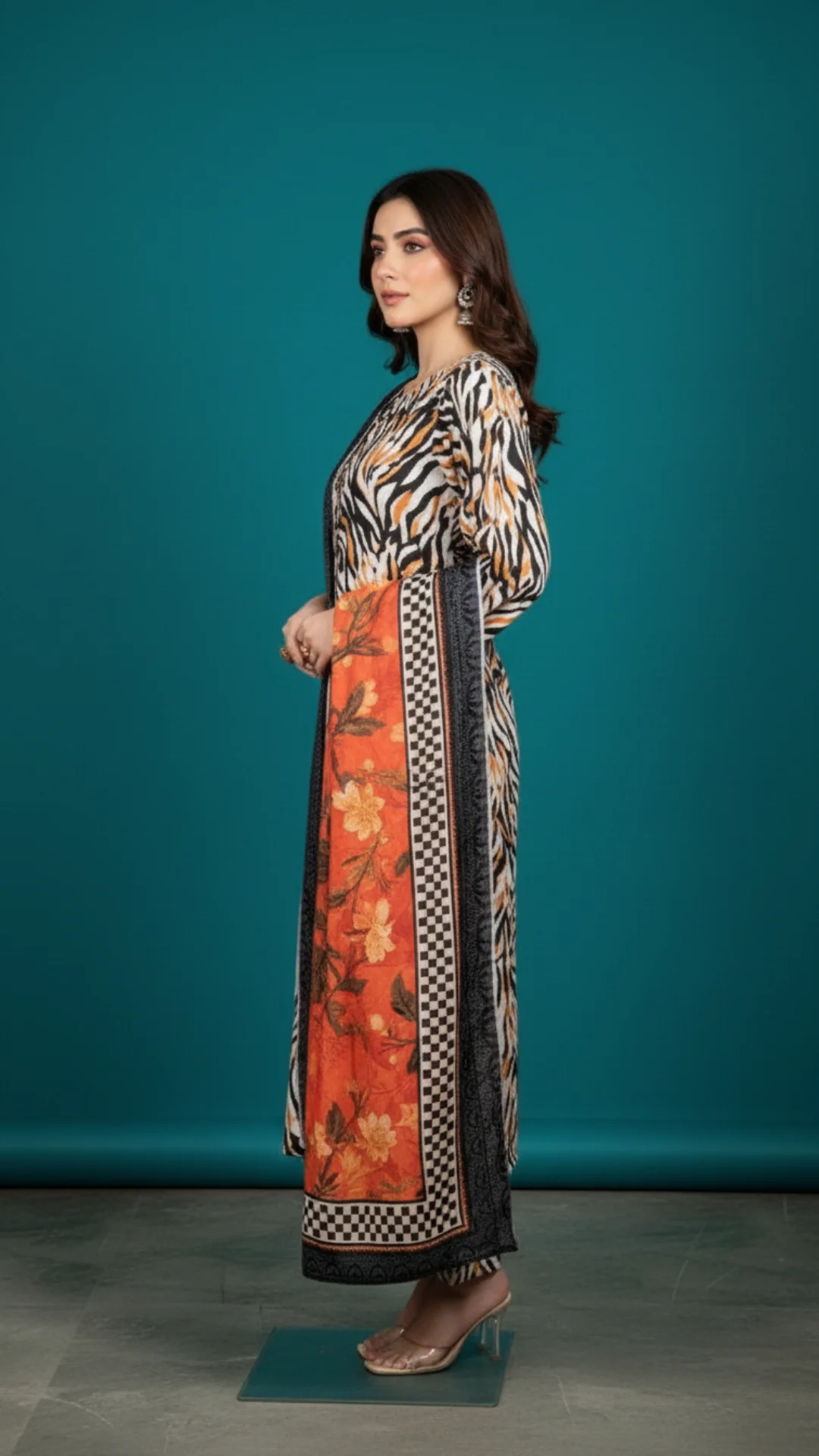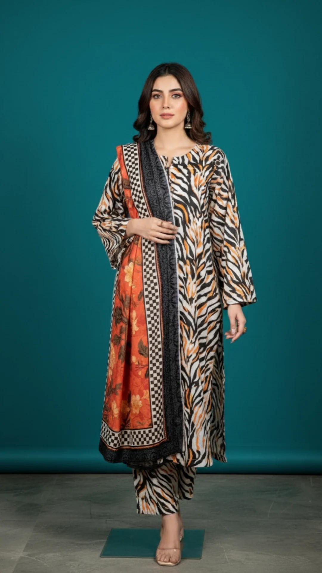 Step into winter with confidence in this stylish multicolor Karandi outfit. The combination of bold animal prints and warm floral tones makes it a standout piece. Crafted from premium branded fabric, it offers both comfort and elegance — perfect for your seasonal wardrobe.