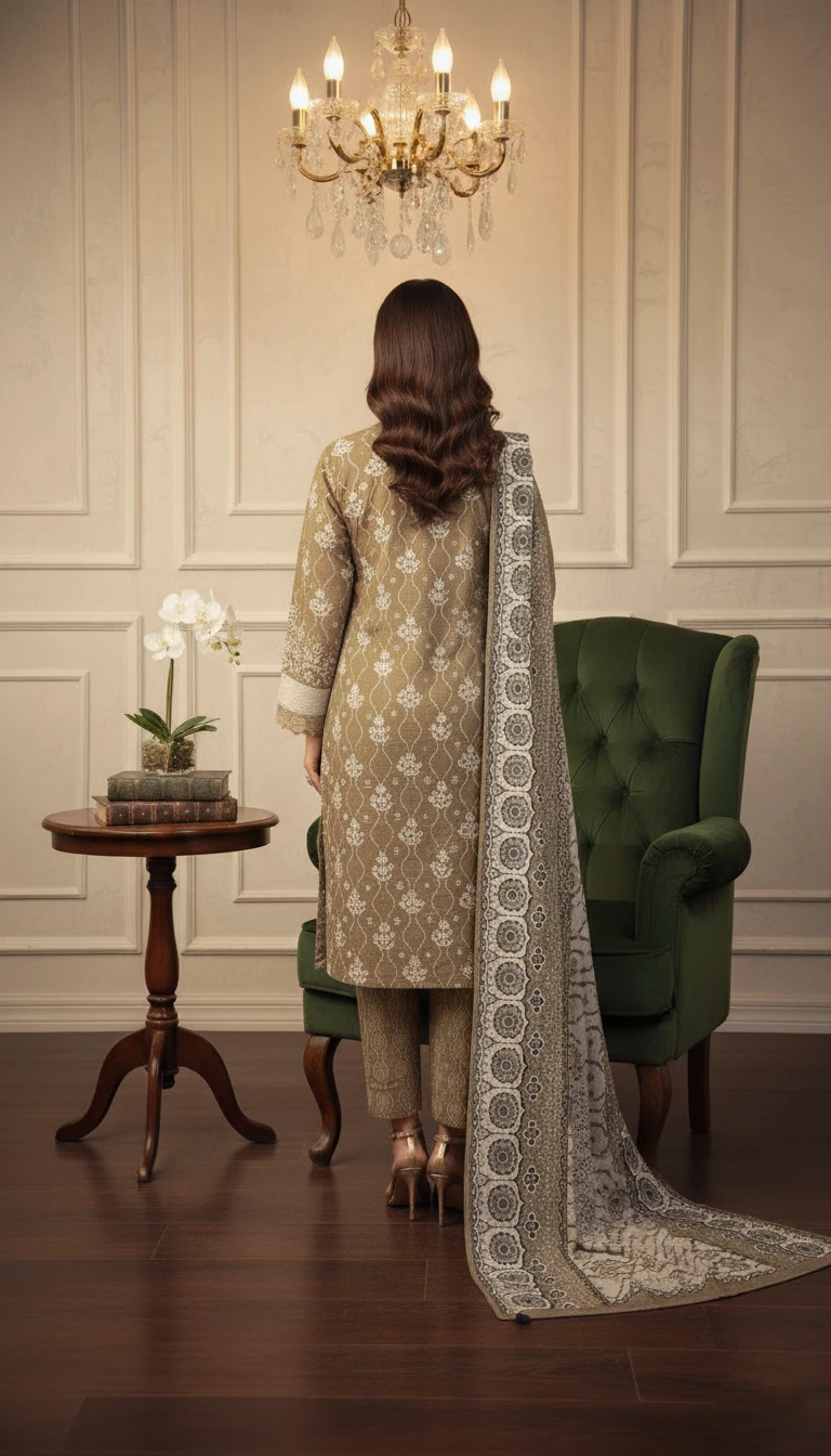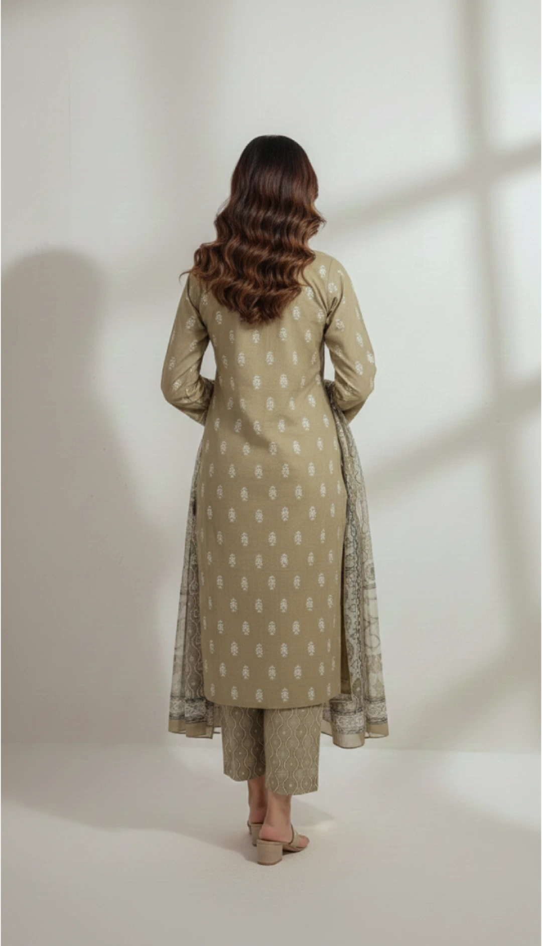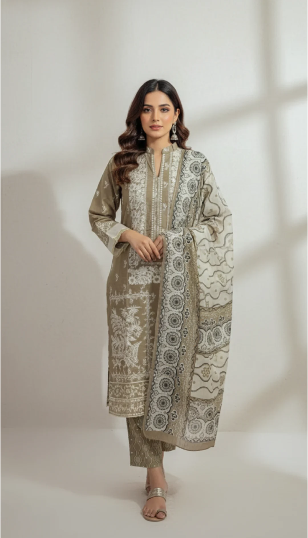 Embrace winter elegance with this premium printed cotton three-piece set, featuring full embroidery, a soft printed dupatta, and a stylish painted trouser. Perfect for festive gatherings and chic seasonal wear.