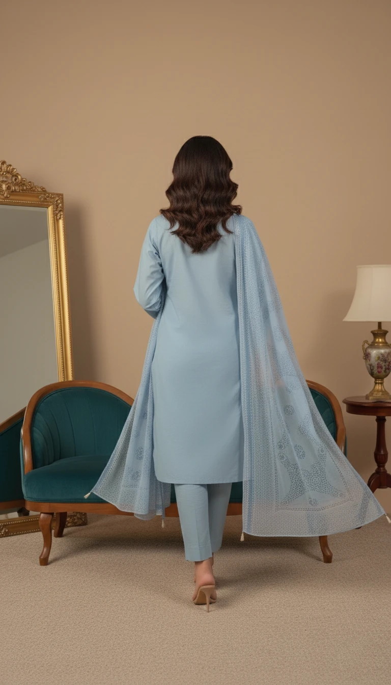Enhance your winter look with this elegant three-piece set, featuring an embroidered neck with organza detailing, a soft printed dupatta, and a plain dyed trouser. Perfect for festive occasions and graceful winter style.