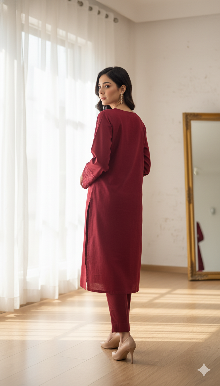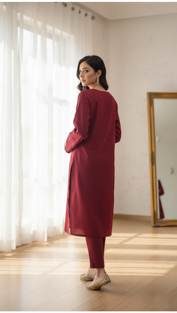 Trouser: Plain dyed Khaddar trouser designed for comfort and a smooth drape