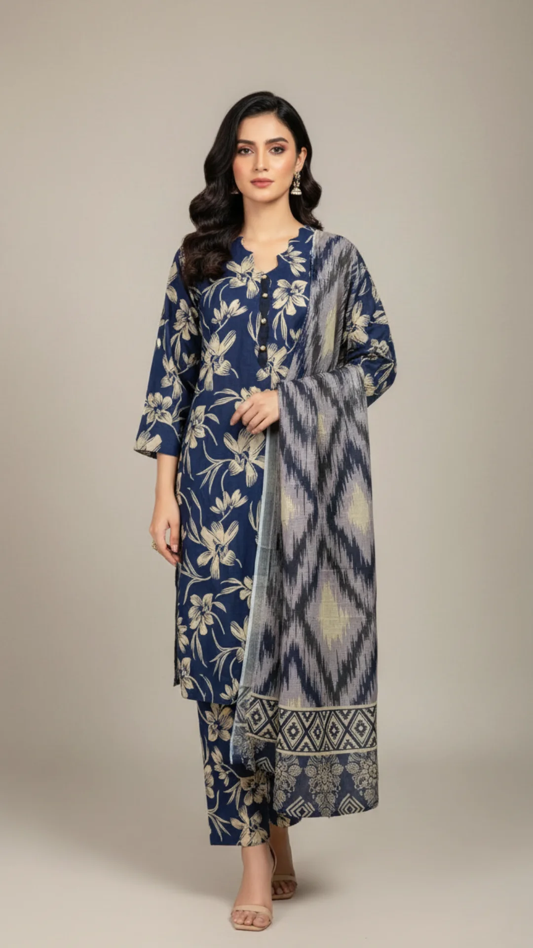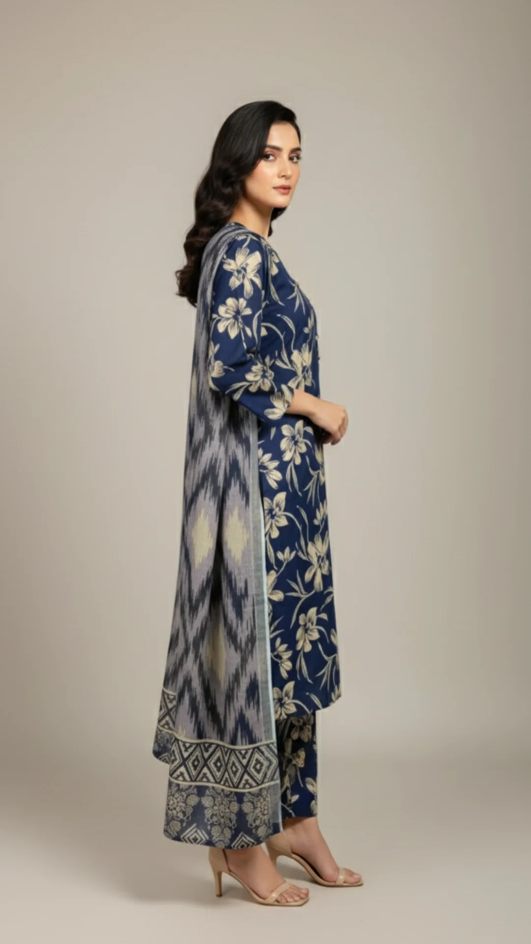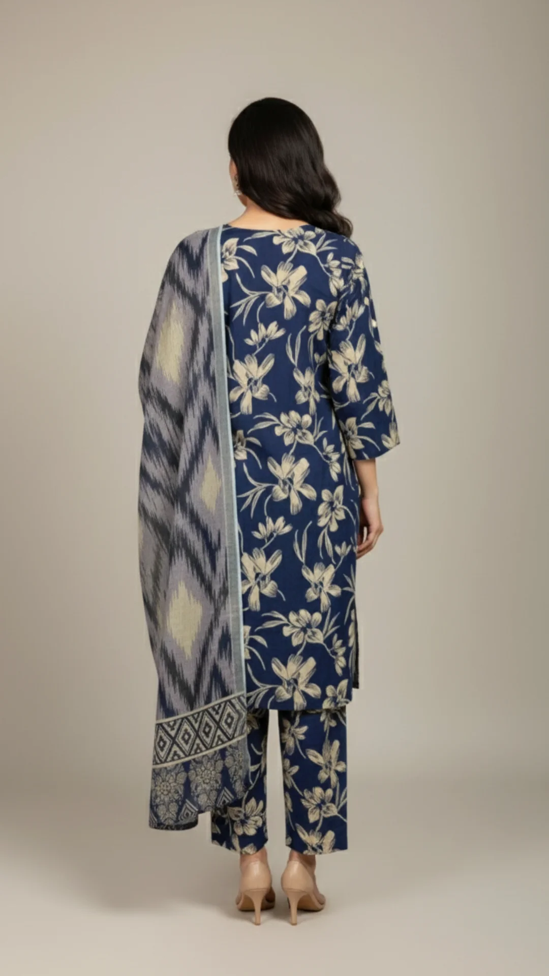 Color:Navy Blue base with Cream/Gold Floral Print and an Ikat Dupatta featuring Grey, Black, and Pale Yellow.