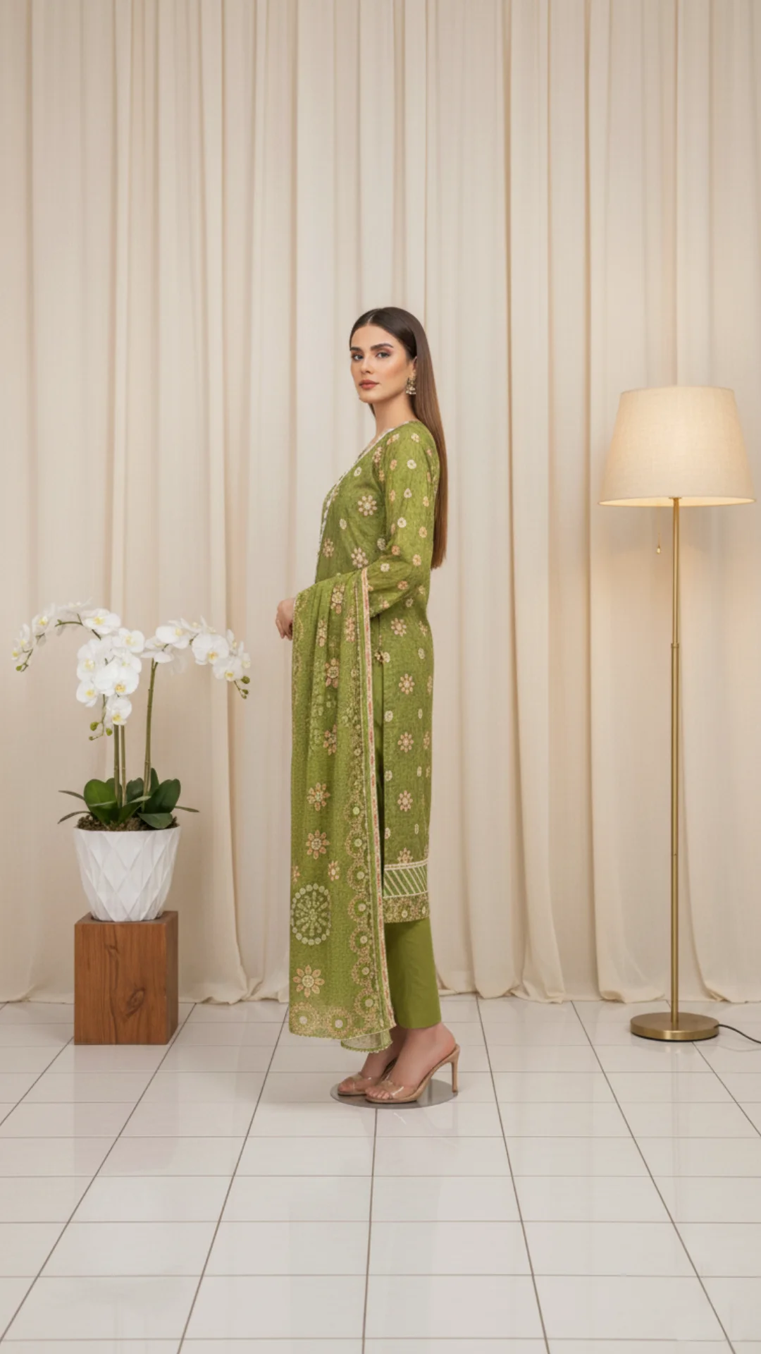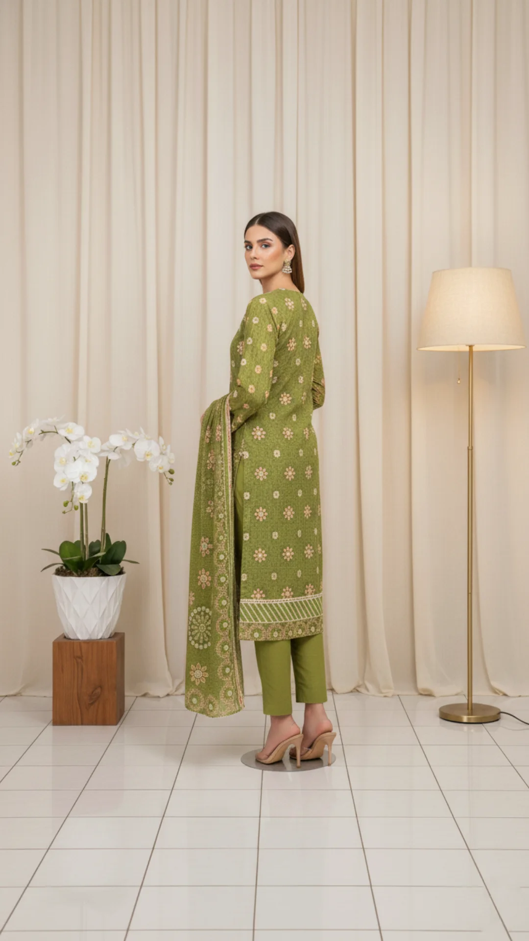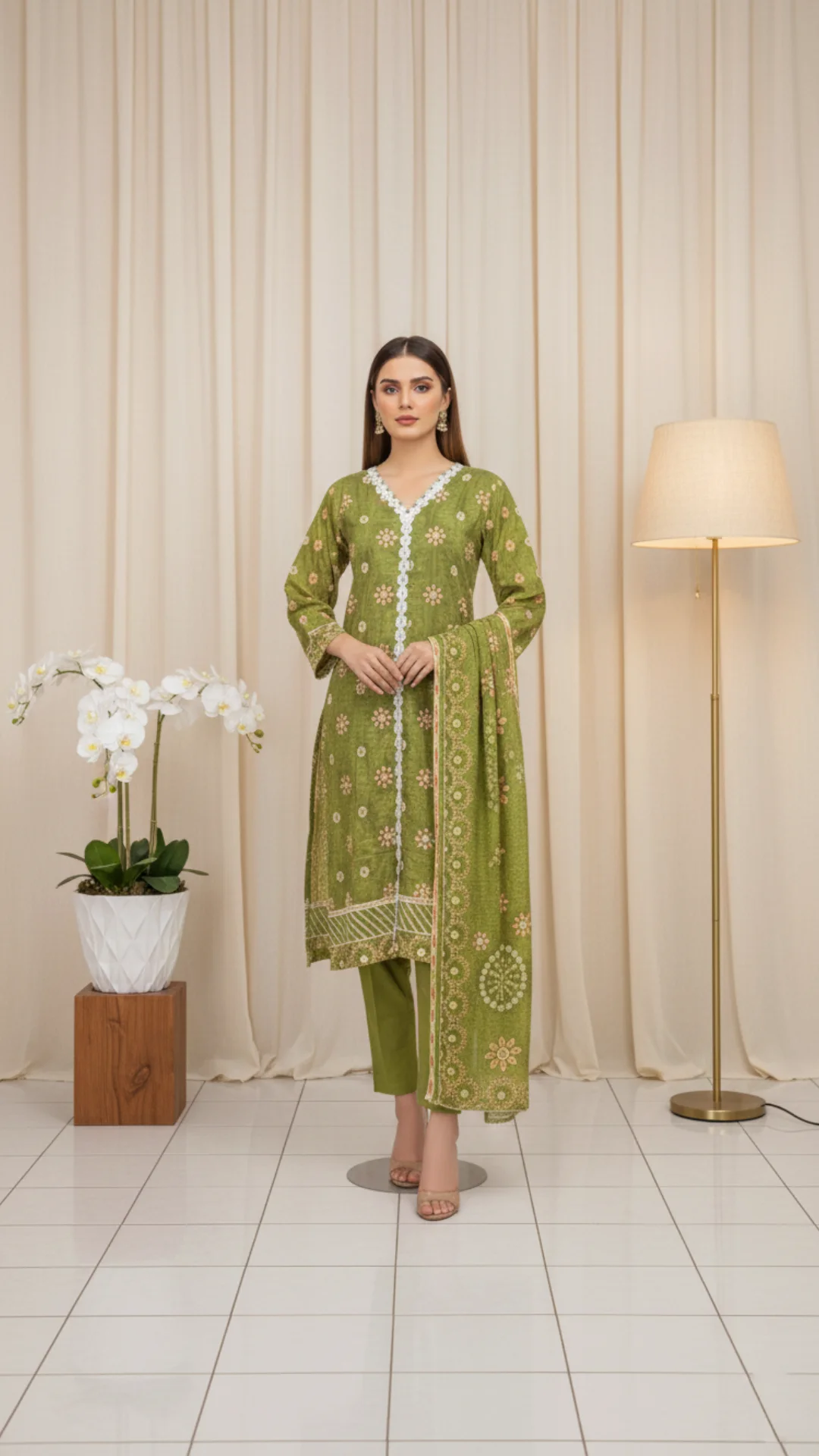 Add a refreshing touch to your winter wardrobe with this elegant olive green Khaddar outfit. The digitally printed shirt adorned with soft floral motifs and delicate lacework pairs beautifully with the matching dupatta and trouser. Crafted from premium branded fabric, it offers both warmth and sophistication, making it a perfect blend of comfort and style for the season.