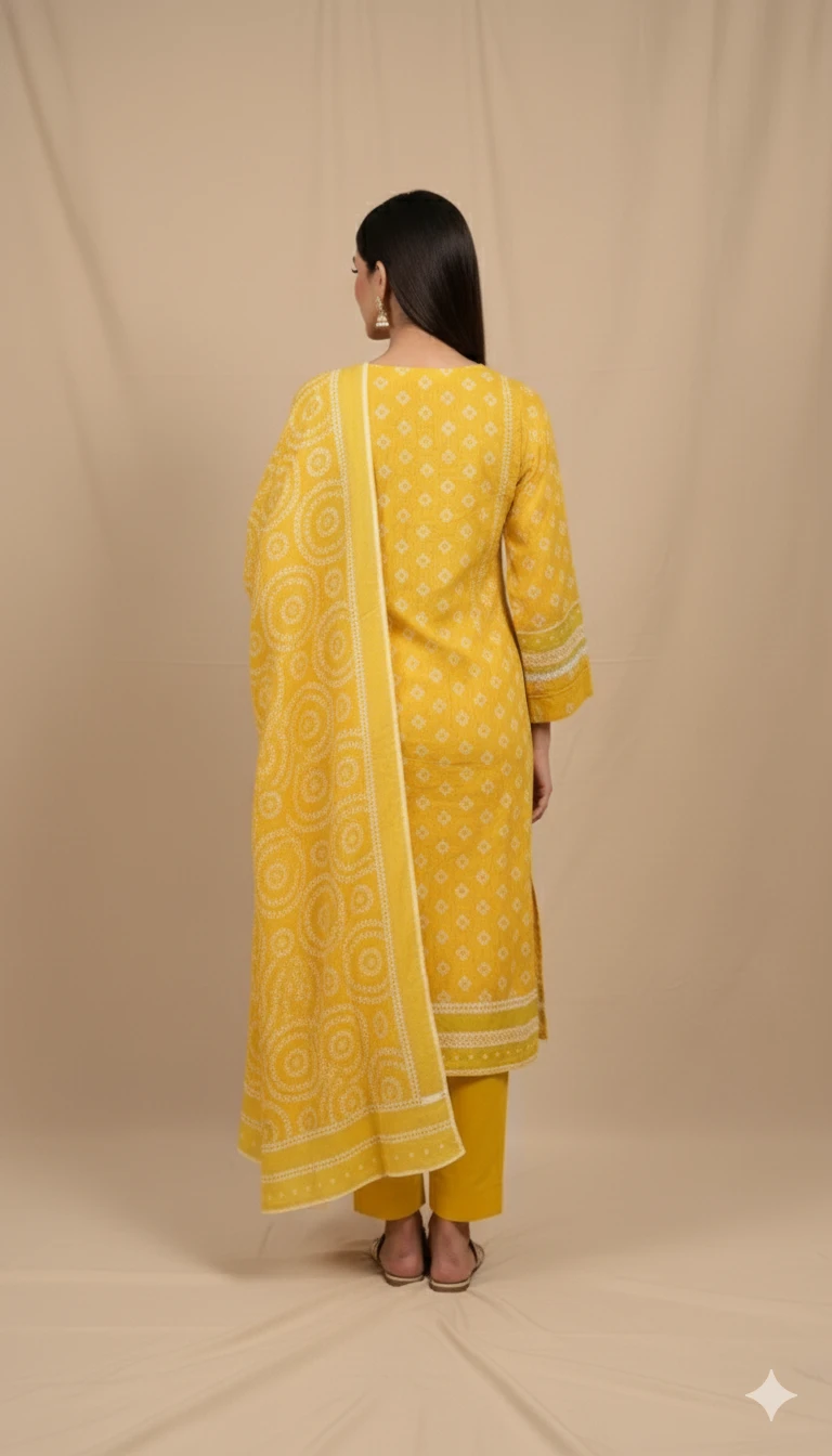 Color: Vibrant Yellow base with White and Lime Green bandhani-style printed patterns.